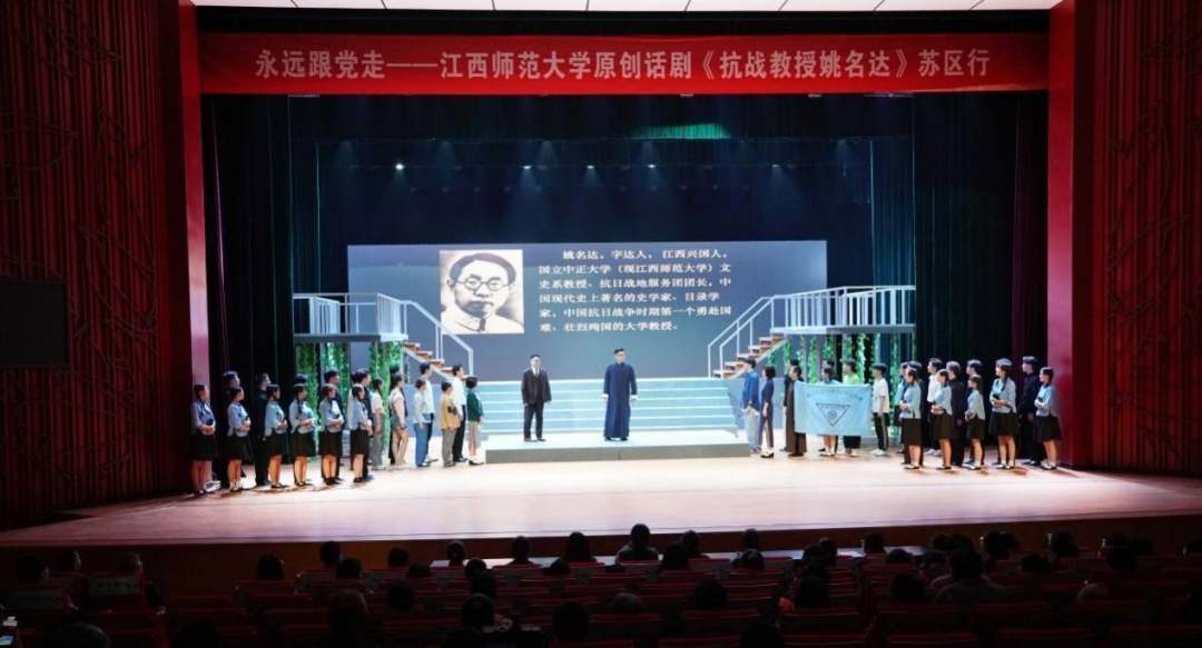 原创话剧《抗战教授姚名达》在姚名达故乡兴国县文化艺术中心•长征大剧院上演。话剧以国立中正大学(现江西师范大学)姚名达教授为原型,讲述了当代大学生借助对现代VR的仿真课堂技术的研究,演绎了深入抗日前线,徒手搏斗日寇、以身殉国的光辉而短暂的一生。