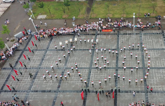 巡演队伍行至青年文化广场时,校国旗护卫队、校女大学生军乐团进行了“红船”“井冈山五指峰”“党徽”“1921”“2021”等图案展示。同学们的高声歌唱,气势澎湃的军乐声,浩浩荡荡队伍的行进声,现场所有的声音汇成一首歌久久回荡在校园上空,令人热血沸腾,倍感震撼。