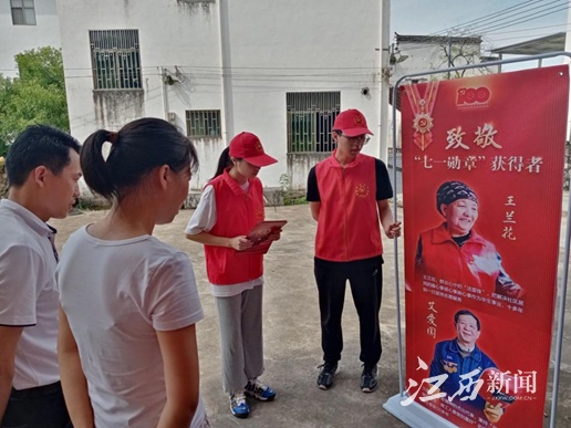 实践队队员仔细介绍着“七一勋章”获得者的先进事迹,居民听得十分认真