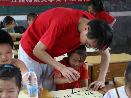 同音”的说法。语言在一定程度上制约着人们的认知水平、生产能力和当地的经济发展。江西师范大学选择井冈山新城镇、景德镇浮梁县鹅湖镇、金溪县杨蒋村面向小学生开设七彩课堂,因地制宜地开展普通话发音、诗词朗诵、红色故事、绘画、书法、体育、折纸等丰富的语言文字教育活动,实施推普助力乡村教育振兴。在新城镇的实践团以年龄段作为标准,将孩子们划分成大、中、小三个班级,制定不同教学方案,开展不同形式的课堂教学;在金溪县杨蒋村开展七彩书法课堂,通过孩子们喜欢的成语接龙等方式导入课堂,激发孩子们热爱汉字形体美、热爱祖国文字的情感;在浮梁县鹅湖镇开展指导孩子们朗诵经典诗文、讲述红色故事活动。七彩课堂寓教于乐,激发孩子们学习语言文字的兴趣,激活了当地基础教育的活力。